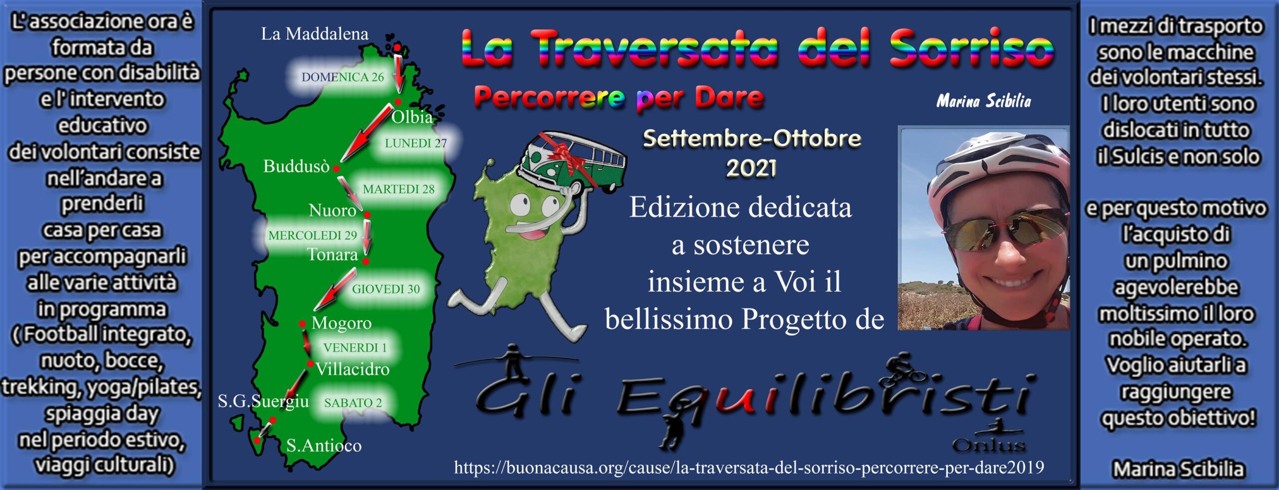 Ha deciso tre anni fa di utilizzare questa passione per dare inizio ad un progetto con FINALITA’ SOLIDALE, a favore di persone con disagi motorii che non permettono loro di camminare e correre, approfittando contemporaneamente per promuovere il TURISMO SOSTENIBILE nel territorio che attraversa, la Sardegna con le sue piccole realtà meno conosciute.