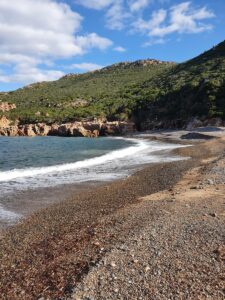 Sul sentiero profumato di macchia mediterranea e di corbezzoli, troviamo anche alcune capanne abitate da pittoreschi personaggi che a volte indicano la via giusta, e dopo l’ultima discesa, aiutati da una provvidenziale cima, ecco apparire Cala Tinnari.